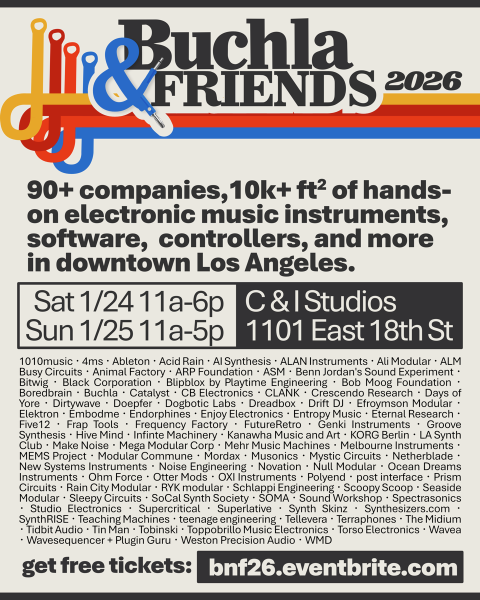 C&I Studios 1101 East 18th Street, Los AngelesWe'll be at Buchla & Friends, January’s biggest two-day collection of hands-on synths on the West Coast! If you love creative sound, you need to be here. With a pre-party on Thursday, afterparty on Saturday, and two days of exploring all the greatest gear, Buchla & Friends is an essential start to the new year. […]